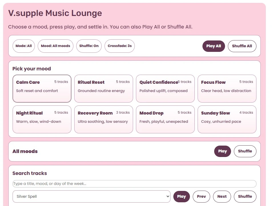 The V.supple® Music Lounge is our mood-based playlist hub. You pick the vibe, press play, and let it carry you through your routine. No overthinking, no skipping around, just a curated set that matches how you want to feel.