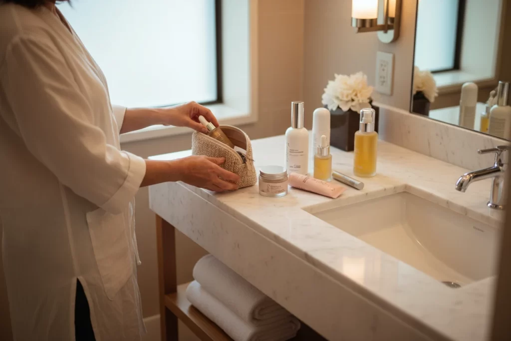 A small, dedicated care pouch that lives in your hand luggage with intimate wipes, a non soap wash and your preferred non hormonal vulval moisturiser can make a large difference in how the first night feels.