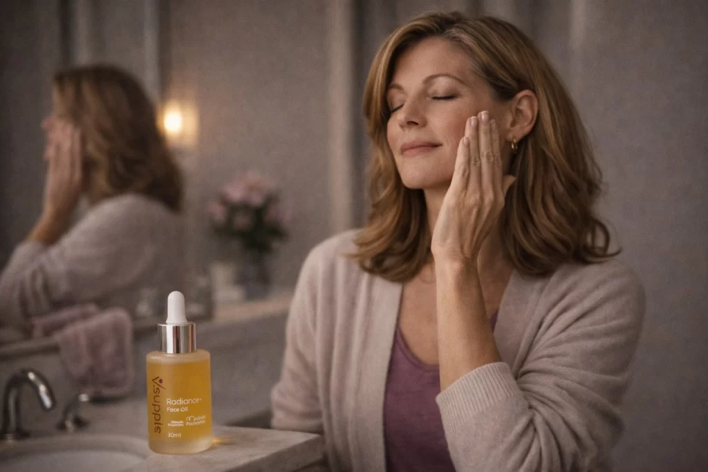 That might look like treating your skin as if it is asking for less friction, not more correction. Menopause-focused dermatology guidance recommends a mild cleanser instead of soap, regular moisturising, and fragrance-free moisturiser when skin is more easily irritated. It also notes that thinner, drier skin may not tolerate harsh or drying products well. In a high-stress season, there is a lot of wisdom in stepping back from aggressive exfoliation, over-layering actives, and punishing your face for looking exactly as tired as your life currently feels.