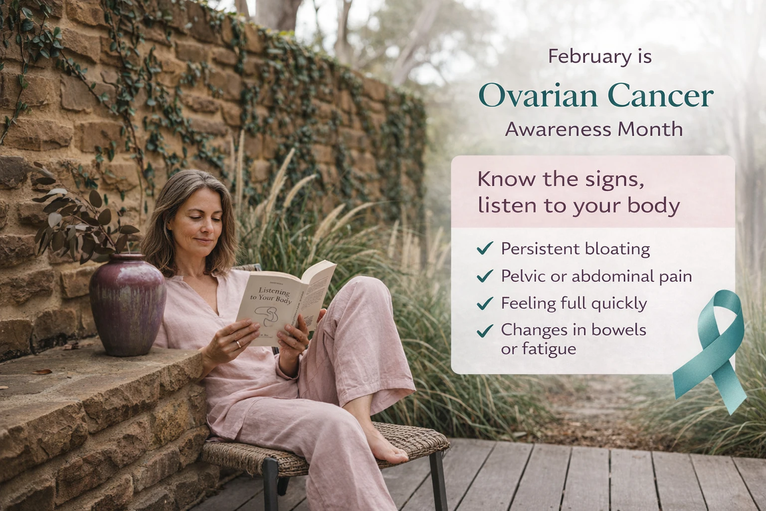 February is recognised nationally as Ovarian Cancer Awareness Month. You may see teal ribbons and teal themed messaging across Australia, designed to encourage earlier conversations, earlier review of persistent symptoms, and better outcomes over time.