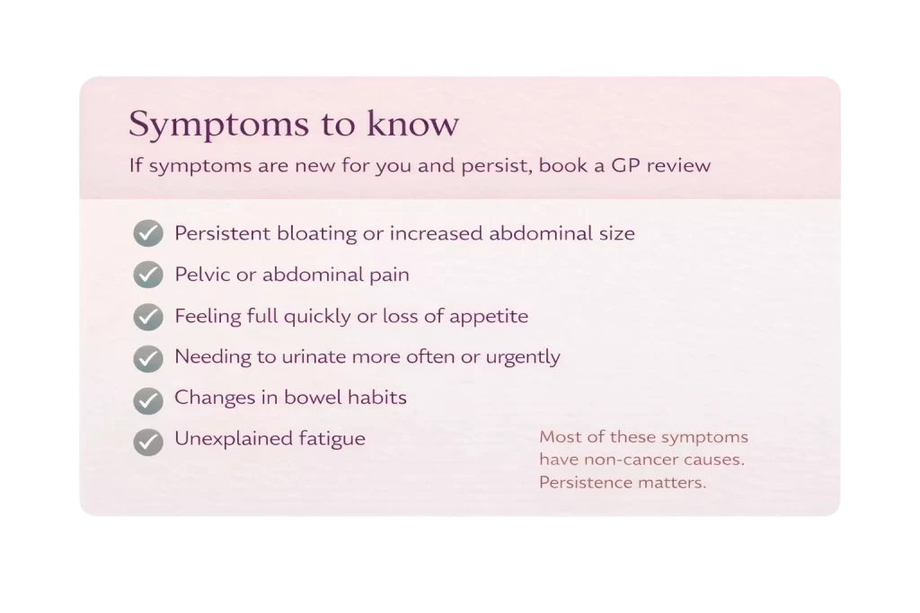 A practical, educational guide to ovarian cancer awareness in Australia: what ovarian cancer is, why early detection is challenging, the symptoms to know, and what to do if something feels persistent or unusual.